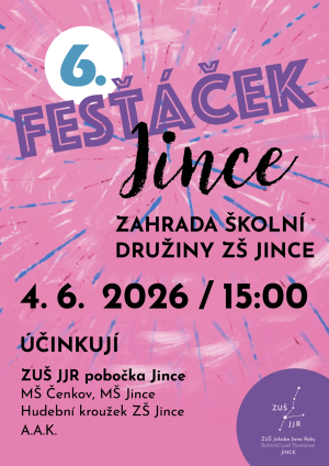 Koncert na školní zahradě. Účinkují žáci jinecké pobočky ZUŠ, MŠ Jince a Čenkov, hudební kroužek ZŠ Jince a kapela A.A.K.