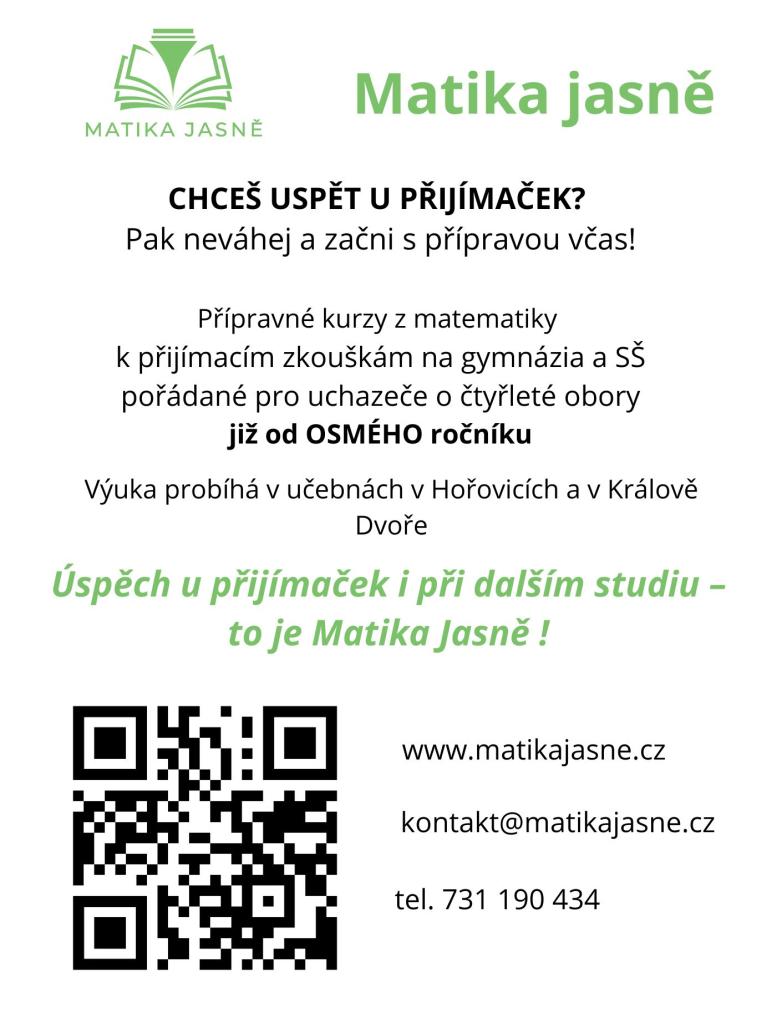 Nabídka přípravných kurzů z matematiky k přijímacím zkouškám na gymnázia a střední školy. Výuka probíhá v Hořovicích a Králově Dvoře.