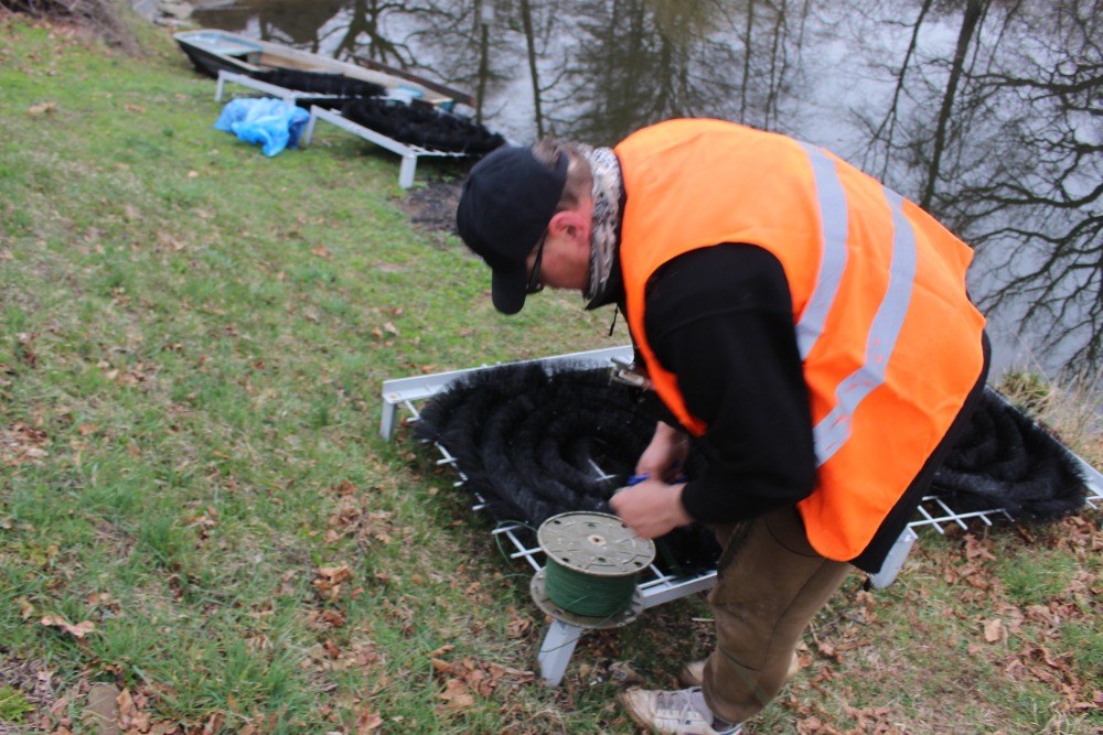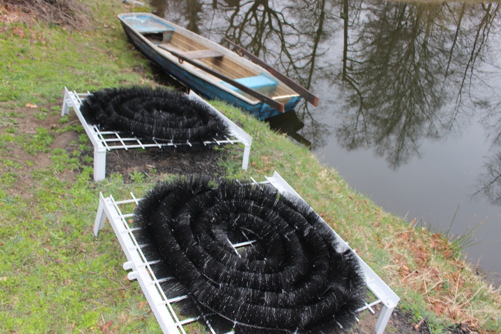 Dne 23. března 2025 jsme s hospodářem provedli instalaci třecích míst pro ryby na chovném rybníku. Rozměry hnízda umožnují dobrou manipulaci na lodi. Po vytažení hnízd na podzim budeme muset udělat ještě drobnější vychytávku v uchycení manipulačního lana. Těmito hnízdy poskytujeme rybám ideální podklad pro kladení jiker.