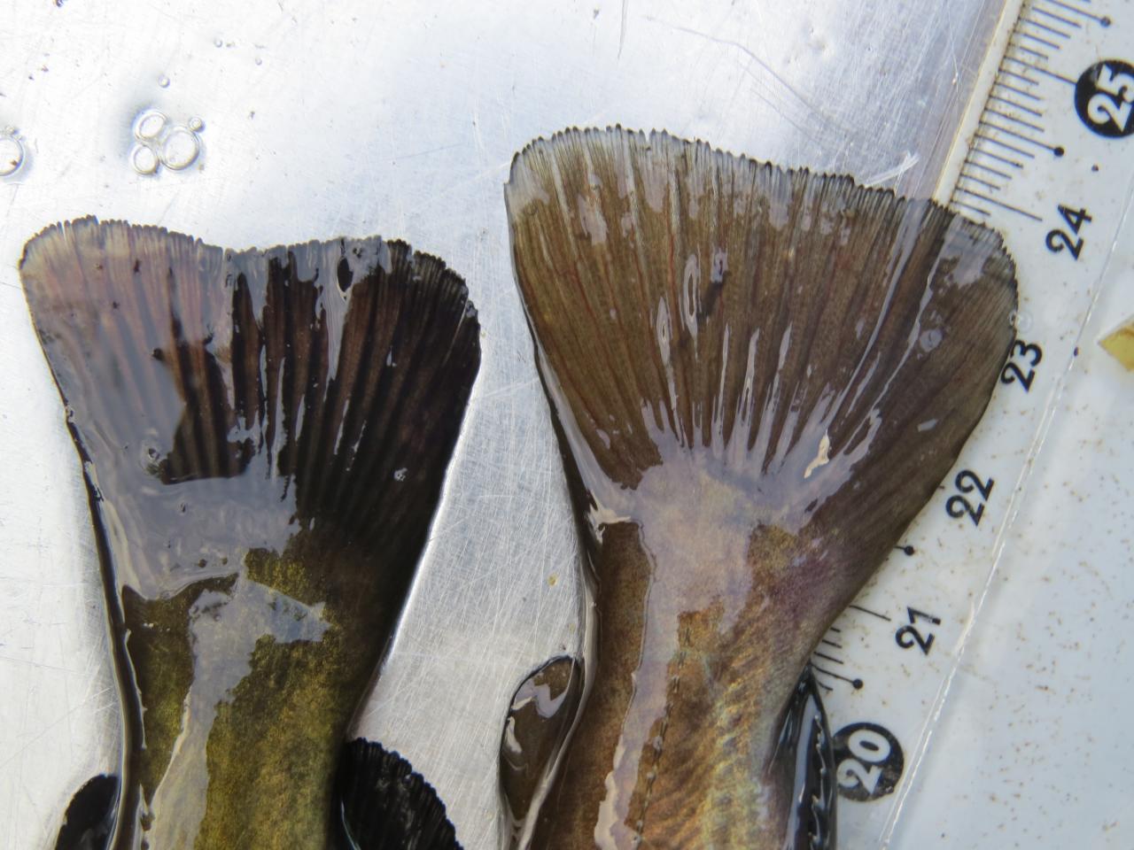 - obr. č. 2 Ocasní ploutvě - sumeček černý (nahoře) a sumeček americký (dole),